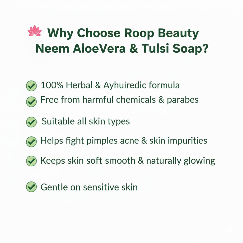 Healthy, glowing, and clear skin is not just a dream anymore. With Roop Beauty Neem AloeVera & Tulsi Soap, you can experience the goodness of Ayurveda in every bath. This herbal soap is carefully crafted with three powerful natural ingredients – Neem, Aloe Vera, and Tulsi – each known for its unique skin benefits. Whether you are struggling with pimples, dullness, or skin dryness, this soap helps restore freshness, radiance, and natural beauty to your skin.
