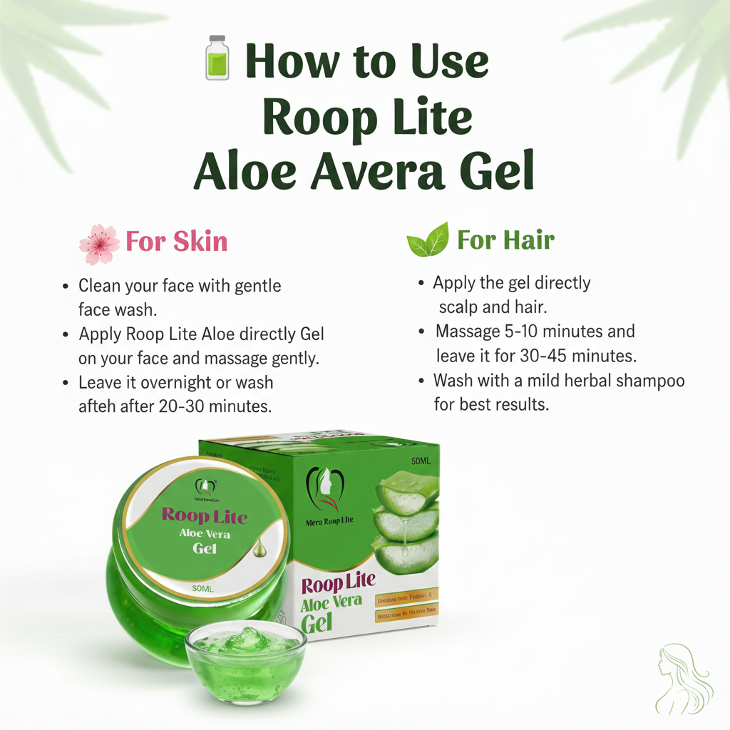 Aloe Vera is known as the “plant of immortality” due to its endless beauty and medicinal benefits. Roop Lite Aloe Vera Gel is a herbal and chemical-free formula that provides deep hydration, nourishment, and protection for both skin and hair. Whether you are struggling with dry skin, acne, pimples, sunburn, dandruff, or hair fall – this aloe vera gel is your perfect natural soluti